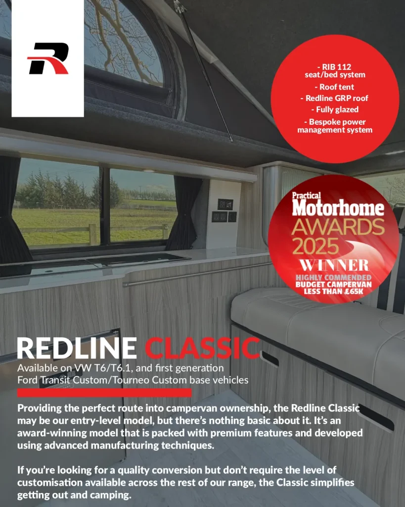 Providing the perfect route into campervan ownership, the Redline Classic may be our entry-level model, but there’s nothing basic about it. It’s an award-winning model that is packed with premium features and developed using advanced manufacturing techniques.