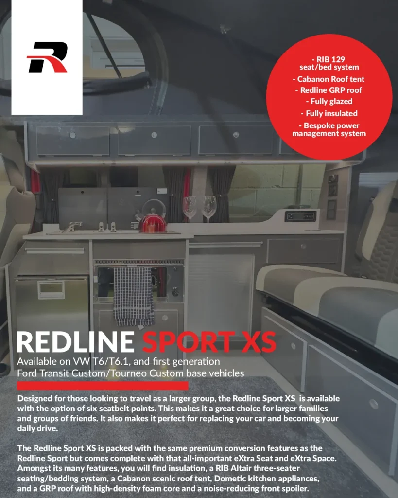 The Redline Sport XS is packed with the same premium conversion features as the Redline Sport but comes complete with that all-important eXtra Seat and eXtra Space. Amongst its many features, you will find insulation, a RIB Altair three-seater seat/bedding system, a Cabanon scenic roof tent, Dometic kitchen appliances, and a GRP roof with high-density foam core and a noise-reducing front spoiler.